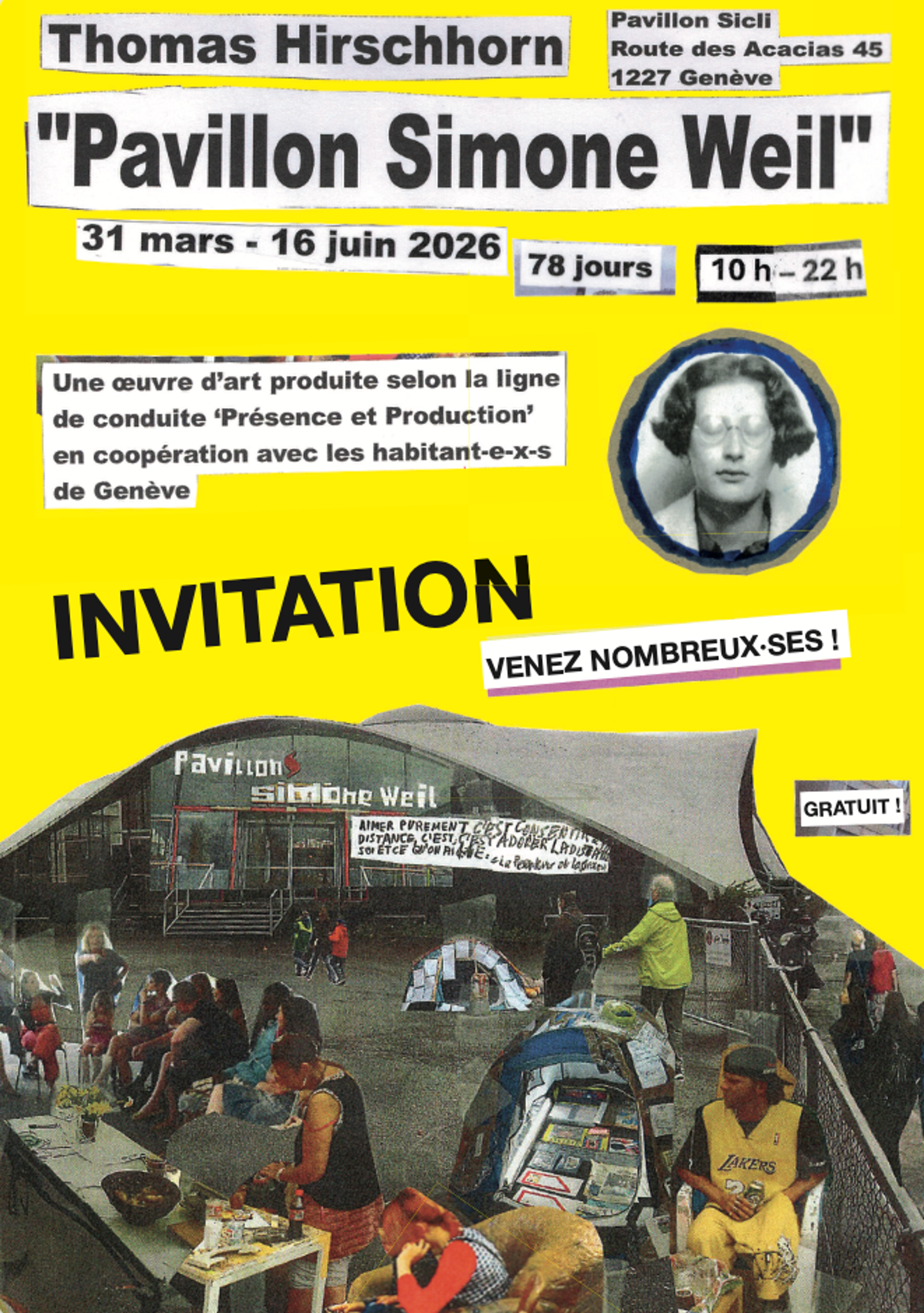 Invité par la Fondation Pavillon Sicli et la Fondation genevoise pour l’animation socioculturelle (FASe) à ouvrir grand les portes du Pavillon Sicli, l’artiste Thomas Hirschhorn propose un monument précaire et éphémère, un hommage à la philosophe française Simone Weil qui sera ouvert au public 7j/7 de 10h à 22h pendant 78 jours.